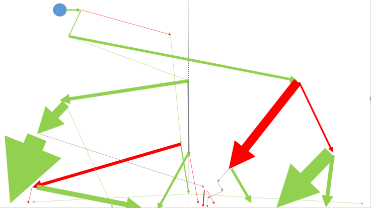 Přerušovaná linie uprostřed ukazuje cílový stav věcí – čím více se od ní konečný stav věcí (tedy umístění špičky poslední šipky dané cesty v šedém pásu dole) odklání, tím méně žádoucí taková závěrečná konstelace je.