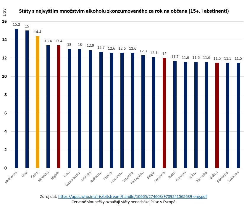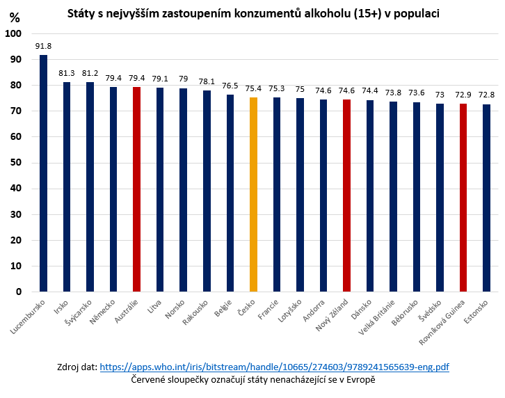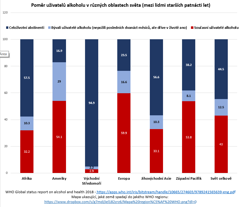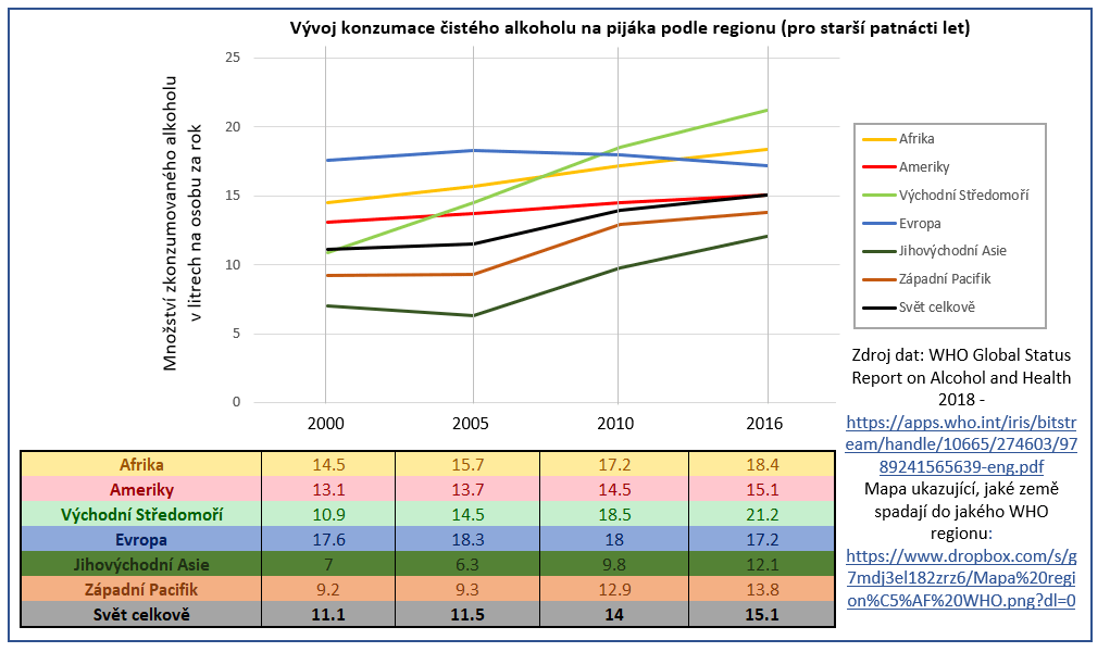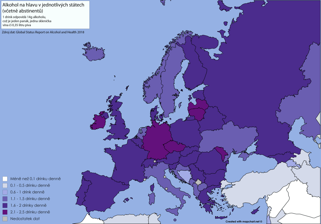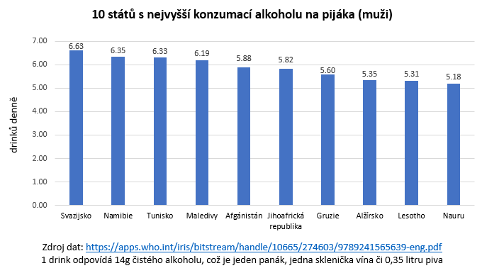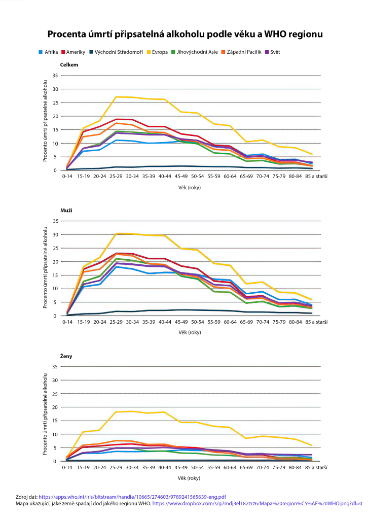 Depozitář všech infografik obsažených v tomto textu je k nalezení zde. Většina z nich bylo převzata z WHO Global Status Report on Alcohol and Health 2018 a přeložena do českého jazyka. Čistá data, na jejichž základě byly tyto vizualizace sestaveny, extrahovaná z výše zmíněného reportu, najdete zde (nutno stáhnout, v internetovém zobrazení soubor nefunguje správně).