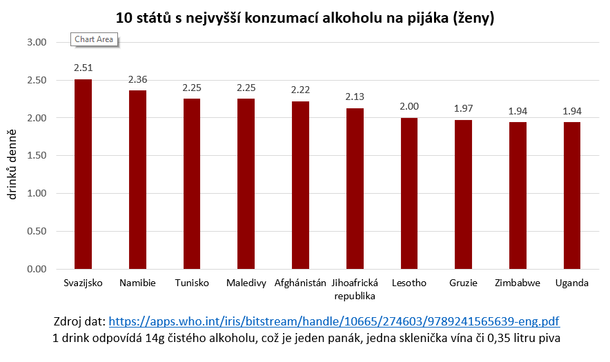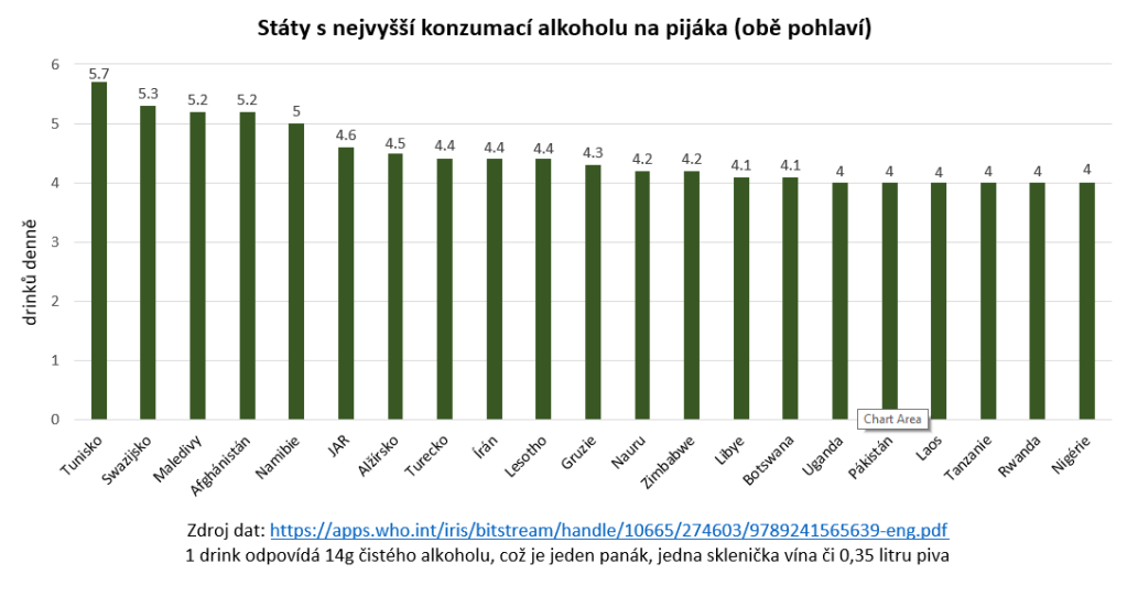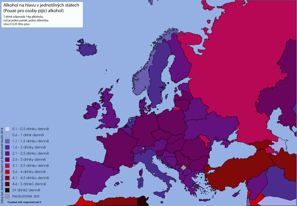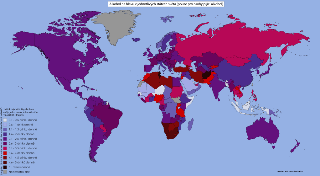 Proto musíme použít třetí z metrik. Pokud se podíváme na mapku konzumace alkoholu na pijáka v tomto regionu, zjistíme zajímavou skutečnost – ačkoliv naprostá většina obyvatel států této oblasti vůbec nepije, ti, kteří pijí, často pijí opravdu extrémně. V případě Tuniska zkonzumuje průměrný pijící občan téměř šest drinků denně, řada dalších místních států na tom není o moc lépe. Nejsem si zcela jistý, čím je to způsobené, a nechtělo se mi opět odkládat vydání článku v zájmu další rešerše, avšak pokud se mi to někdy v budoucnu podaří zjistit, věnuji tomu samostatný text.