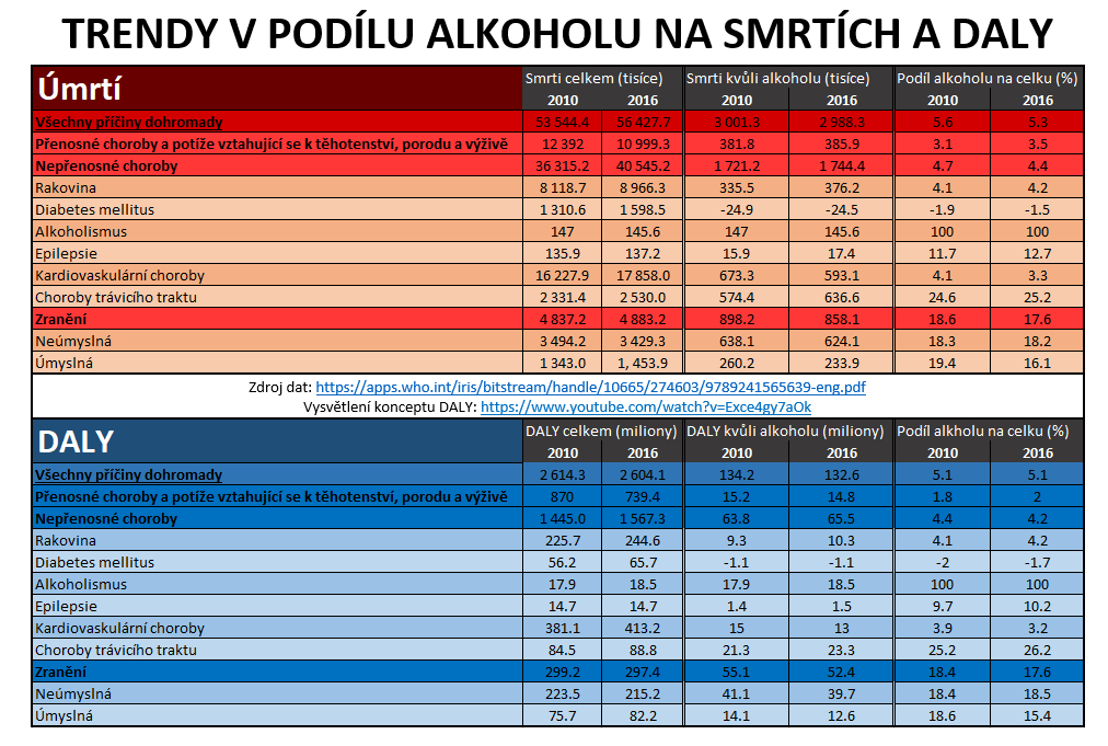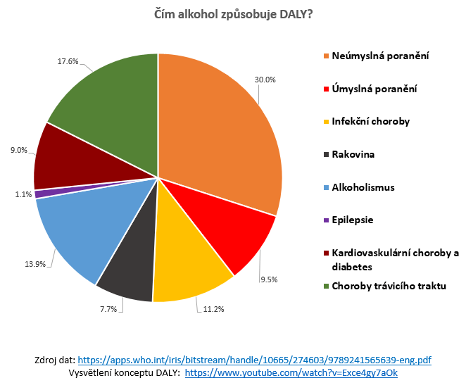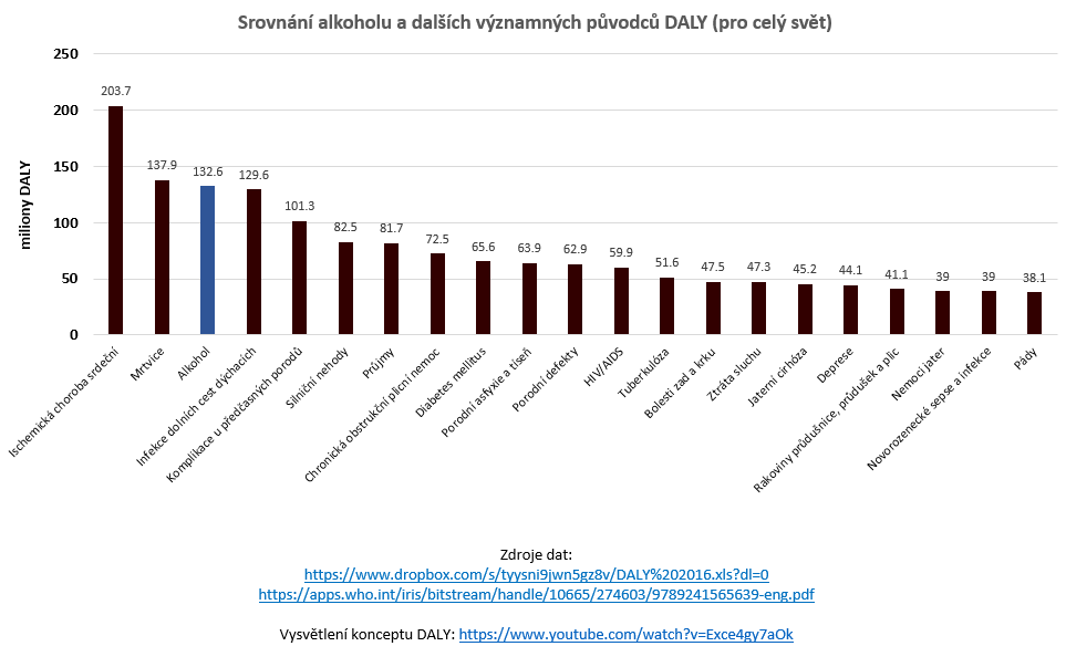 Letmý pohled na data WHO ohledně původců DALY odhalí, že alkohol jich v roce 2016 přivodil skoro stejně jako mrtvice a infekce dolních cest dýchacích, asi o polovinu více než průjmová onemocnění a silniční nehody, asi dvakrát více než diabetes mellitus a AIDS a asi třikrát více než bolesti zad a krku a deprese. Do těchto čísel jsou započítány i existující (ač malé) pozitivní efekty alkoholu, které budeme velmi podrobně rozebírat v budoucích článcích této série.