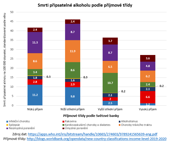 Ani v případě ekonomických tříd nejsou negativní společenské dopady alkoholu rovnoměrně rozloženy. V případě úmrtí jsou skupiny nízkého a nižšího středního příjmu více než o polovinu hůře zasaženy než skupina s vysokým příjmem. U DALY je rozdíl menší, ale přesto patrný. Na druhou stranu, alkoholem-způsobená rakovina postihuje více právě skupiny s vyšším příjmem.