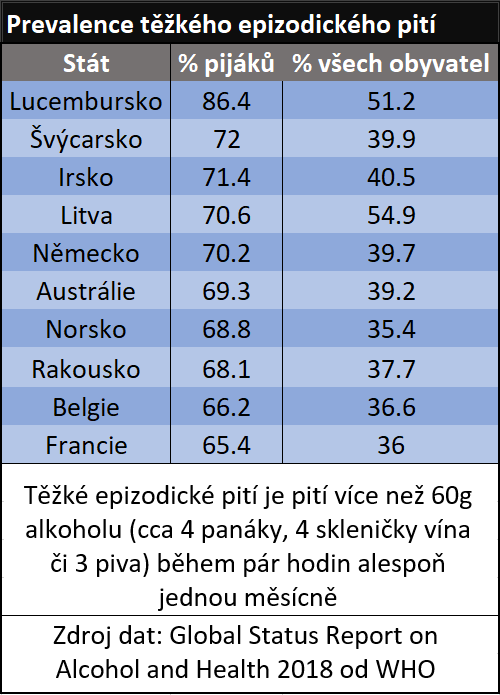 Celosvětově takto pije 39,5 % lidí konzumujících alkohol. Toto číslo platí i pro většinu WHO regionů kromě Afriky a Východního Středomoří. V prvním jmenovaném regionu jde o přesně polovinu pijáků, v druhém jen o 10 %. To je zajímavé, protože jak jsme si ukazovali výše, onen malý zlomek obyvatel islámských zemí, který pije, pije opravdu hodně. Data o HED by tedy naznačovala, že pijí pravidelně a intenzivně, ne jen jednou za čas, ale o to víc, jako je to běžné například v Evropě.