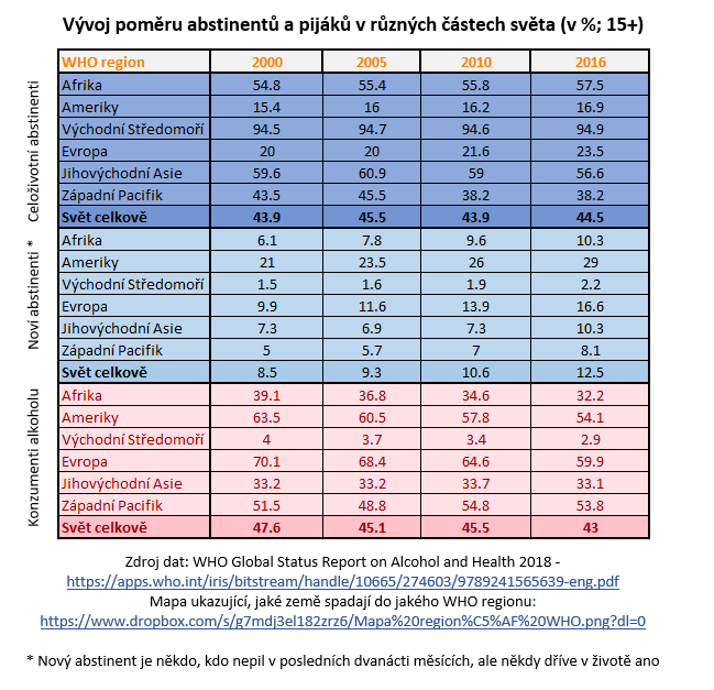 Množství lidí užívajících alkohol se dlouhodobě snižuje. Zatímco v roce 2000 jej podle WHO pilo 47,6 % světové populace starší patnácti let, v roce 2018 to bylo přesně 43 %. Tento trend lze vypozorovat i ve většině jednotlivých regionů WHO – jediným, ve kterém množství pijáků od roku 2000 vzrostlo, je Západní Pacifik. Na vině je především Čína, kde množství celoživotních abstinentů kleslo z 50,9 % na 42,1 %. Pokud opomineme vliv Číny, zbytek tohoto regionu kopíruje celosvětový trend odlivu množství uživatelů alkoholu.