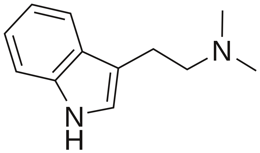 DMT (na obrázku výše), s nímž je většina mých čtenářů patrně dobře seznámena, je klasickým příkladem mírně substituovaného tryptaminu. Jediné, co má oproti základní kostře navíc, jsou dvě methylové skupiny (každá je tvořená uhlíkem a třemi vodíky) připojené na řetězcový dusík. I takto malá změna však stačí k tomu, aby z patrně fenomenologicky neaktivního tryptaminu udělala jedno z nejmocnějších známých psychedelik co se týče subjektivních efektů.