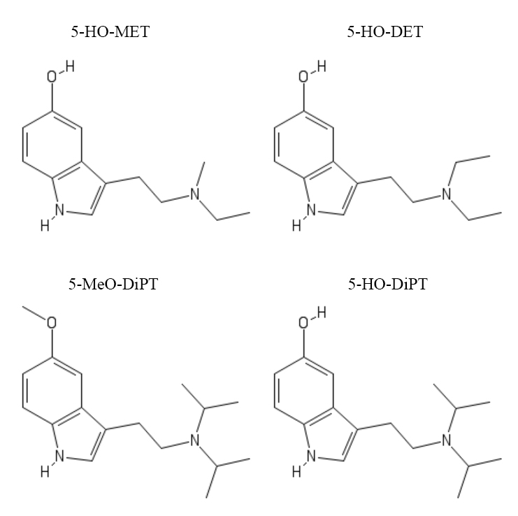 Jako první se samozřejmě nabízí hydroxylová varianta DMT, tedy 5-HO-DMT či 5-hydroxy-N,N-dimethyltryptamin. Tato molekula existuje a ve skutečnosti je vědě i psychonautům dobře známá – je jí totiž bufotenin. Ten je jednoznačně psychedelikem a vyznačuje se extrémním posílením hmatových prožitků, což je pro tuto třídu látek poměrně netypický efekt – většina z nich jej sice může vyvolávat, ale ne konzistentně, zatímco u bufoteninu jde o významnou část jeho efektů. Naopak jeho vizuální efekty jsou velmi slabé, což vytváří zajímavý kontrast oproti ostatním psychedelikům.