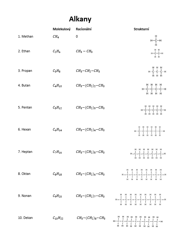 Jak můžeme vidět na obrázku výše, jednotlivé alkany se od sebe liší jen množstvím uhlíků (a samozřejmě vodíků, které se na ně váží a které se na diagramech typicky neukazují). Ethan je vyšší homolog methanu, pentan je nižší homolog hexanu a vyšší homolog butanu a tak dále.