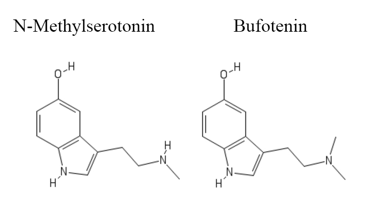 Pokud bufotenin ochudíme o jeden methyl na dusíku, získáme norbufotenin, také známý jako N-methylserotonin či 5-HO-NMT. Ten je daleko méně známou látkou než bufotenin, ale výzkumy ukazují, že také aktivuje 5-HT2A receptory, a tedy by měl být psychedelikem. Jak jsme navíc popisovali v jiném článku, N-methylserotonin také dost možná hraje roli v prožitcích blízkých smrti.