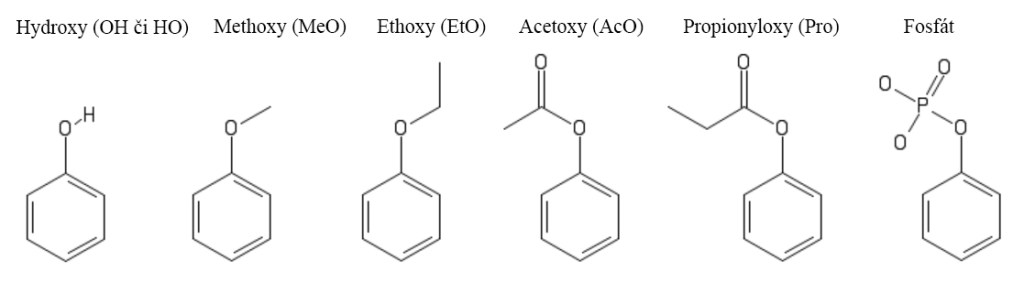 Substituovat jde ovšem nejen hydroxy skupinu. Často používané jsou také methoxy a acetoxy skupiny, méně často například ethoxy či propionyloxy skupiny. Fosfátová skupina se vyskytuje u přírodních psychedelik, ale u syntetických je z důvodů, jež si ještě budeme vysvětlovat, využívána poměrně vzácně.