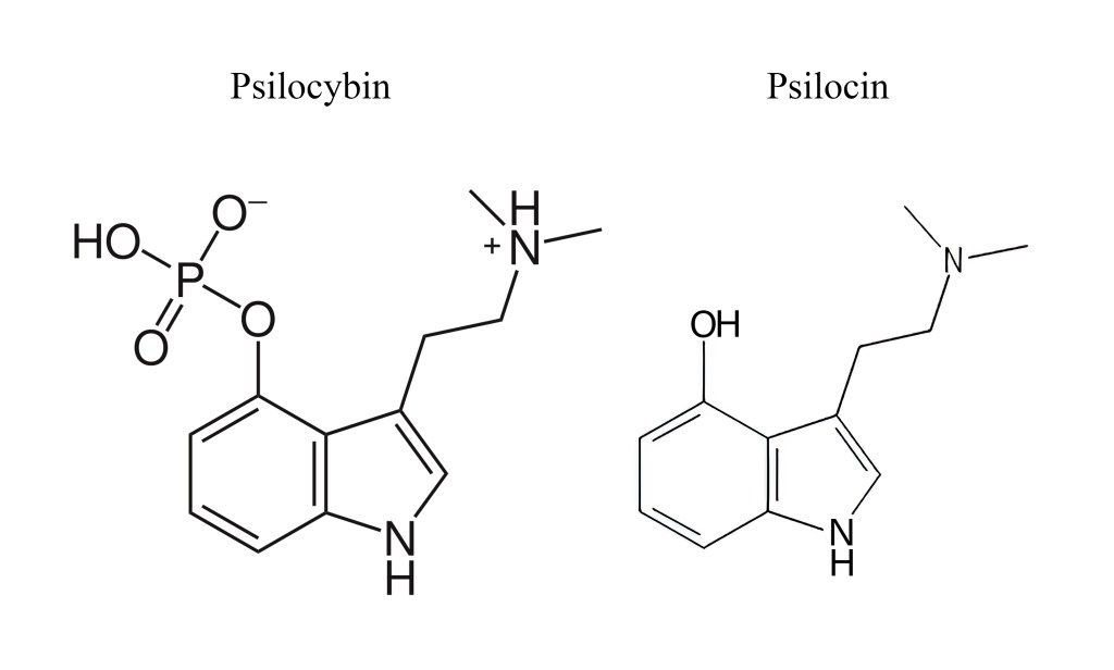 Jedním z nejznámějších psychedelik jsou samozřejmě lysohlávky, respektive psilocybin, který v sobě obsahují. Ten ve skutečnosti sám o sobě příliš aktivní není, protože je v těle rychle rozložen na psilocin, u kterého je fosfátová skupina vyměněna za hydroxy skupinu.