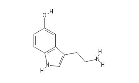 Zpátky k serotoninu. Někdy se mu také říká 5-HT, což je zkratka pro 5-hydroxytryptamin. Proč zrovna takový krkolomný název? Protože jde ve skutečnosti o chemický kód, který nám ihned prozradí, jak molekula serotoninu vypadá. ‘Tryptamin’ je prostě tryptaminem, právě takovým, jaký jsme si ukázali výše, a ‘5-hydroxy’ znamená, že serotonin má na rozdíl od základního tryptaminu na 5. substituční pozici připojenou hydroxy skupinu, což je vodík navázaný na kyslík.