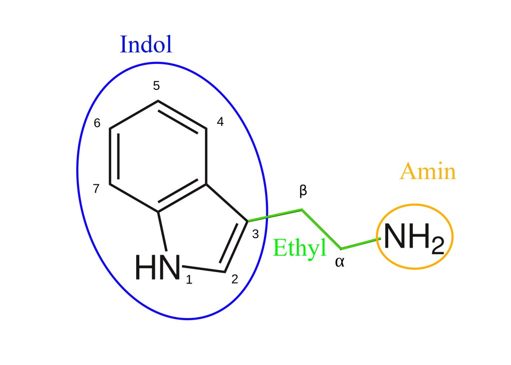 Na obrázku níže je zobrazena základní struktura tryptaminové molekuly. Skládá ze z indolového jádra (modře), ethylového řetězce (zeleně) a aminové skupiny (neboli dusíku s vodíky) na konci tohoto mostu (oranžově). Čísla a písmena řecké abecedy označují pozice, na nichž lze provést tzv. substituci neboli náhradu vodíku nějakou zajímavější chemickou skupinou.