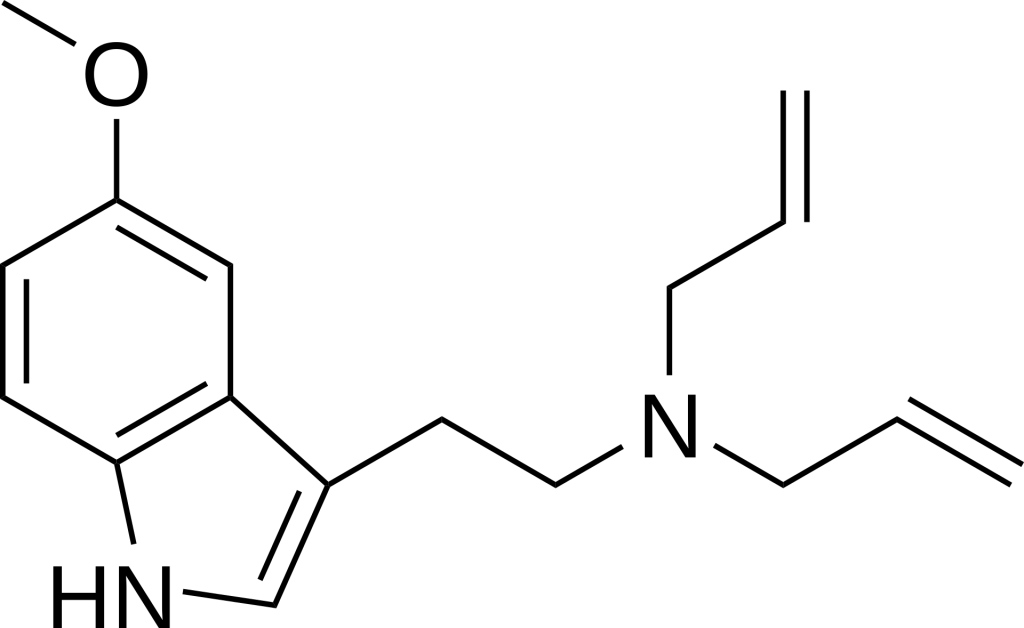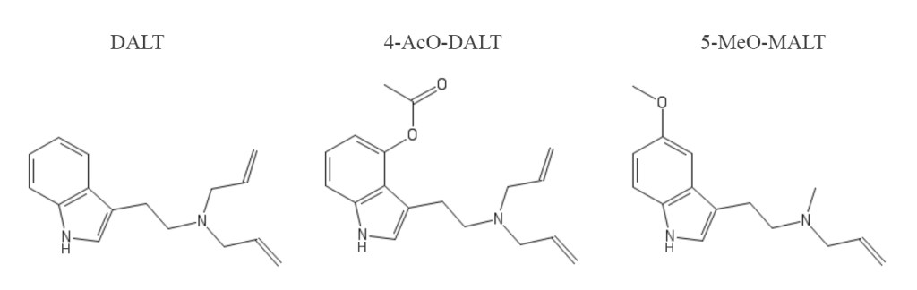 Nejznámnější látkou tohoto druhu je 5-MeO-DALT, který obsahuje hned dvě allylové skupiny (ono ‘D’ v jeho názvu označuje ‘di’, tedy dvojnou přítomnost stejné skupiny, podobně jako třeba u DiPT). Strukturálně jde o látku velmi podobnou 5-MeO-DPT, jen je část jednoduchých vazeb nahrazena dvojnými. Bylo by zajímavé obě látky srovnat, ale jak jsme si říkali výše, o 5-MeO-DPT se neví prakticky vůbec nic, takže máme smůlu.