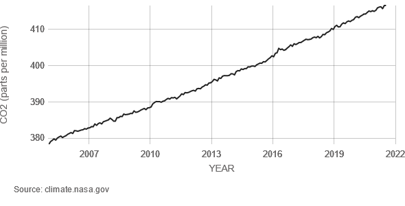 Jak je vidět z předchozích grafů, současná koncentrace CO2 v atmosféře je zhruba 417 ppm (částic na milion částic ve vzduchu), neboli 0,0417%, což je zhruba o 140 ppm více než před začátkem industriální revoluce. Pro srovnání, během konce poslední doby ledové byl nárůst koncentrace CO2 ‘pouze’ 95 ppm – a i to stačilo k obrovským změnám v prakticky všech ekosystémech a proměně podoby celé planety.