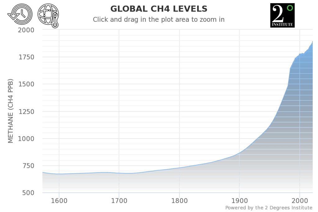Koncentrace methanu v atmosféře je výrazně nižší než koncentrace oxidu uhličitého, ovšem v důsledku lidské činnosti je také na vzestupu. Zatímco koncentrace oxidu uhličitého vzrostla od začátku industriální revoluco o 50 %, koncentrace methanu se zvýšila dokonce o 140 % z původních 775 ppb (částic na miliardu částic vzduchu) na současných 1891 ppb. Jednou z hlavních přičin tohoto nárůstu je průmyslový chov dobytka, neboť krávy a ovce během svého zažívání produkují methanu značné množství.