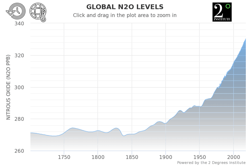Oxid dusný neboli rajský plyn má ještě mnohem silnější skleníkový efekt než methan, a to hlavně proto, že v atmosféře zůstává zhruba 10x déle, neboli 100 let. GWP oxidu dusného za těchto sto let činí 298, je tedy zhruba 300x silnější, než oxid uhličitý. Většina emisí tohoto plynu pochází ze zemědělství, například z hnojiv na bázi dusíku. Naštěstí je nárůst koncentrací tohoto plynu pomalejší, než u methanu a CO2, od začátku industriální revoluce se jeho koncentrace zvýšila ‘jen’ o 22 %.