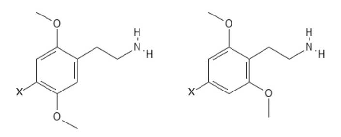 Vpravo: substituční struktura 2,4,6 (Ψ-2C-x)