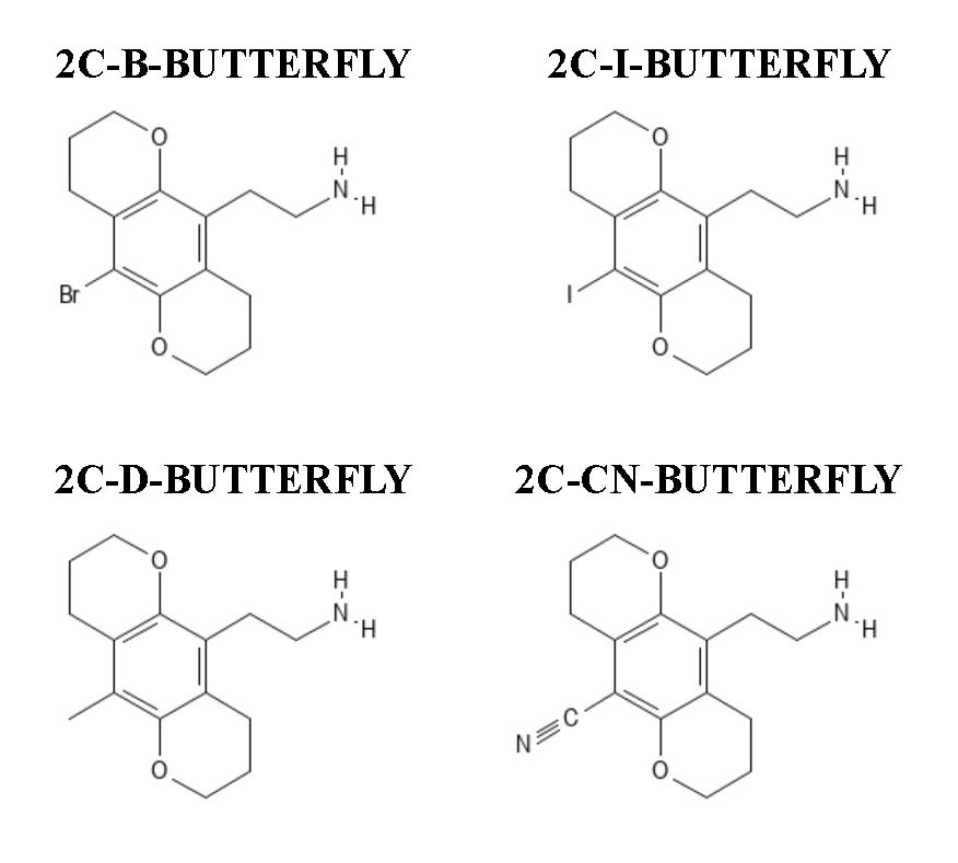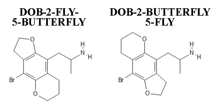 Výsledkem byly nesymetrické substance, kdy jedno z ‘křídel’ zůstalo furanové a druhé se změnilo na pyranové. Vznikly tak dvě látky, jimž patrně nikdy nebyly přiřazeny triviální názvy – podle později ustanovené nomenklatury pro příbuzné substance bychom jim ovšem snad mohli říkat DOB-2-FLY-5-BUTTERFLY a DOB-2-BUTTERFLY-5-FLY (název ‘butterfly’, česky ‘motýl’, je odvozený od skutečnosti, že pyranové křídlo je fyzicky větší než křídlo furanové, jež se objevuje u běžnějších FLY fenylethylaminů).