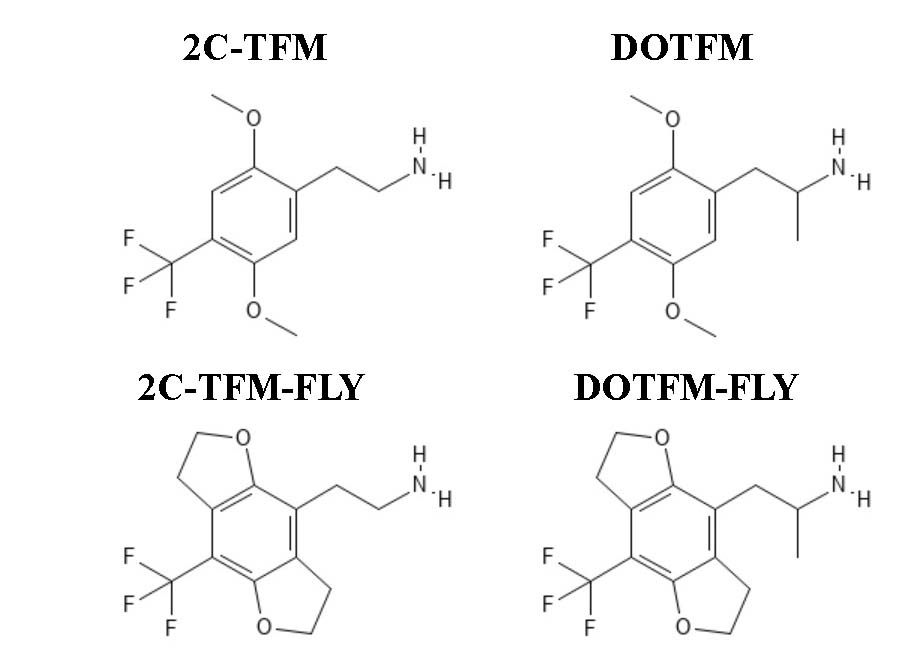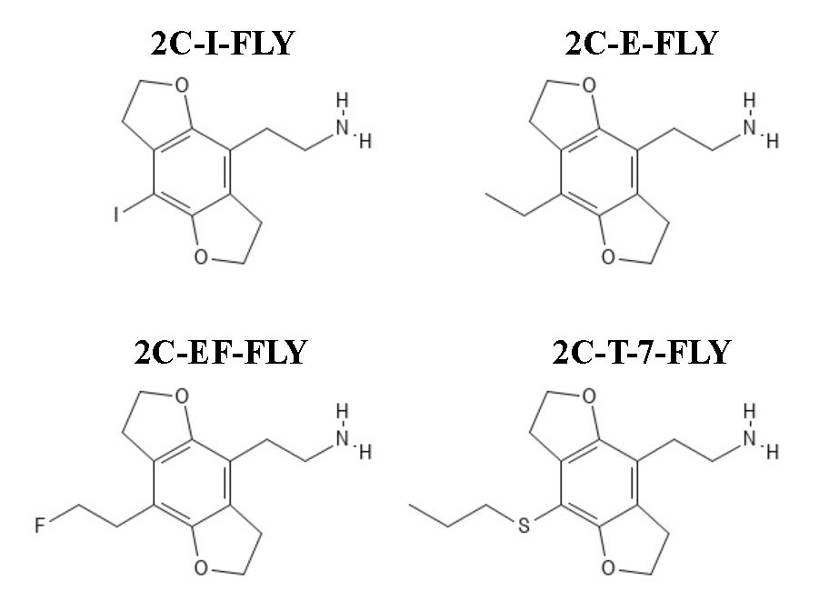 Na některých ovšem byly provedeny alespoň testy na zvířatech3, z nichž lze přeci jen něco usuzovat. Například 2C-E-FLY je údajně jen o trošku slabší než 2C-B-FLY, zatímco 2C-EF-FLY a 2C-I-FLY byly dvakrát, respektive třikrát slabší v navození specifického pohybu hlavy u hlodavců (tzv. ‘head-twitch response’ či HTR), jenž je poměrně dobře podložený jako doklad psychedelické aktivity. 2C-B-FLY v tomto testu dosahuje stejných výsledků jako 2C-B, což tak nějak koresponduje skutečnosti, že obojí jsou subjektivně zhruba stejně intenzivní látky. Připraveno13 bylo i 2C-T-7-FLY.