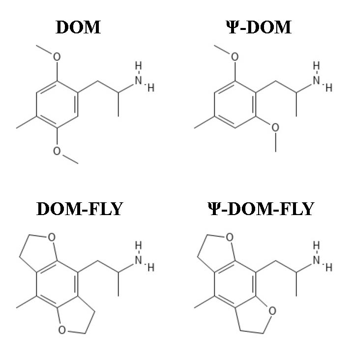 Jak jsme si ukazovali v některých z předchozích článků, s pozicemi methoxy skupinami na fenylethylaminové kostře si jde poměrně kreativně hrát. To se logicky přenáší i do hrátek s ‘křídly’ – pokud přesuneme kyslík normálně přítomný na páté pozici DOM na pozici šestou, dostaneme látku s vynikající afinitou na 5-HT2A receptor, která se nazývá Ψ-DOM (či psi-DOM). Pokud následně proměníme methoxy skupiny ve furanová křídla, vznikne Ψ-DOM-FLY.